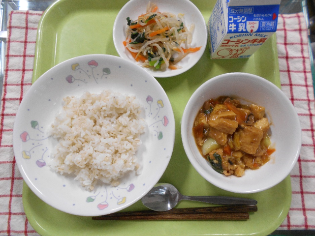 寒くなってきて白菜がおいしい季節となりました。給食でも白菜を使うことが増えてきました。今日は、生揚げや豚肉と一緒に中華炒めにしました。みそやごま油、豆板醤などでごはんがすすむ味付けにしました。生揚げが入っているのでいつもの麻婆豆腐よりもコクがあり、子どもたちからも好評でした。