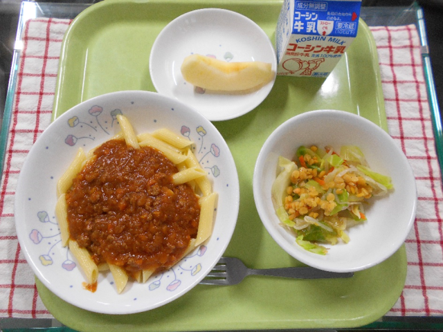 ボロネーゼは、板橋区の友好都市でもあるイタリアのボローニャ市発祥の料理です。挽肉と刻んだ野菜でソースを作りました。また、今日はスパゲッティではなく、ペンネを使用しました。いつもと違う形のパスタに興味を持ちながら食べていました。