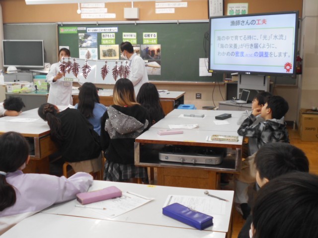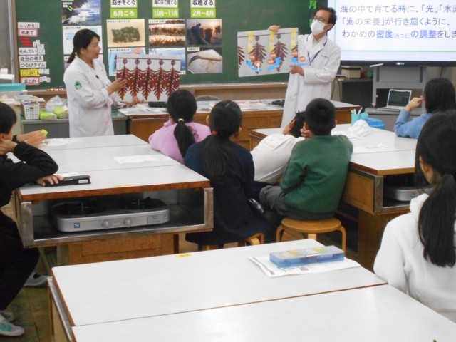 家庭科室で育てる漁業に関する出前授業がありました。具体的にはわかめの養殖についてです。どんな道具を使って、どのように、誰が育てているか、工夫や努力、苦労など様々な視点で学びました。普段口にするわかめがどのように育てられているかを、詳しく知ることができました。