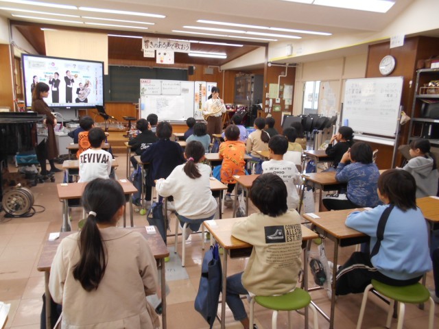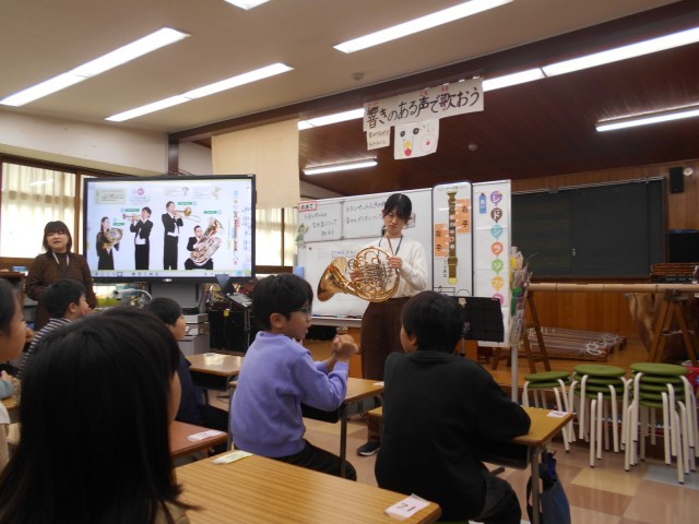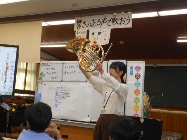 栄養士の先生が学生の頃にホルンを吹いていたので、ゲストティーチャーとしてお迎えしました。トランペットとの違いを説明したり、ホルンの音色を聞かせてくれました。児童は、低い音や音が響く様子を感じることができました。