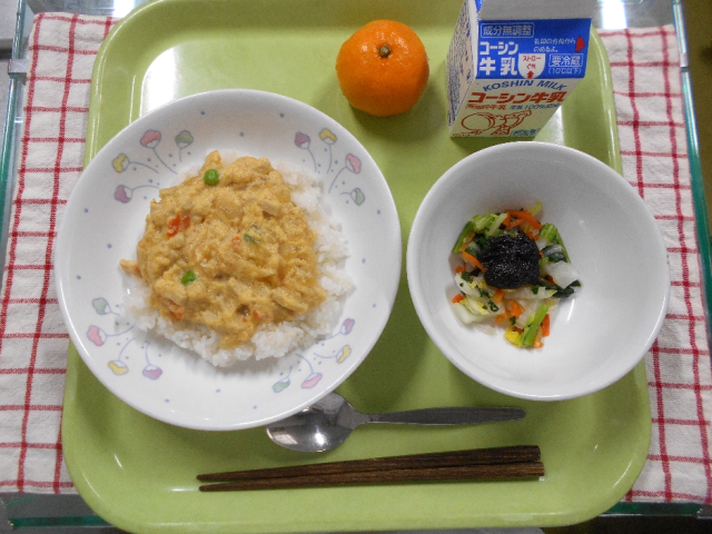 変わり親子丼は鉄分強化献立です。鉄分を多く含む高野豆腐を加えた親子丼です。片栗粉でとろみをつけて絶妙なタイミングで卵を流し入れながら加熱することでふんわり仕上がります。いそか和えは、のり入りのたれを和えた和え物です。のりの風味がしっかりと感じられます。