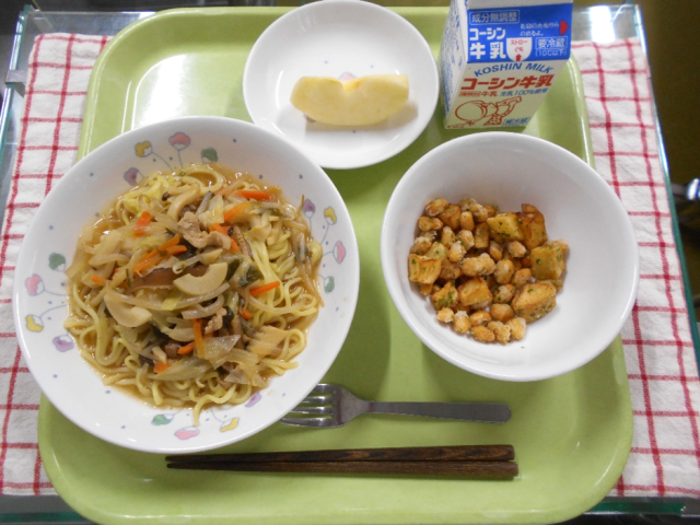 しょうゆラーメンは、リクエスト給食主食部門で1位になった料理です。午前中から楽しみしている声が聞こえてきました。特製の鶏がらスープに醤油などで味付けしています。給食では塩分を抑えて具材をたっぷり入れています。具材もしっかり食べていました。