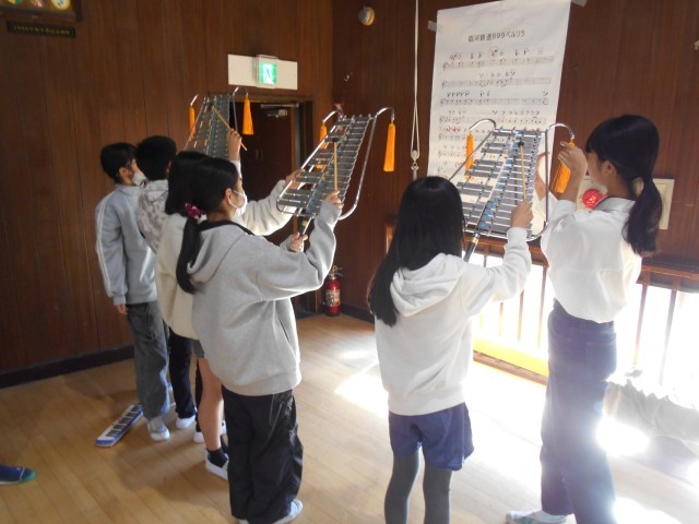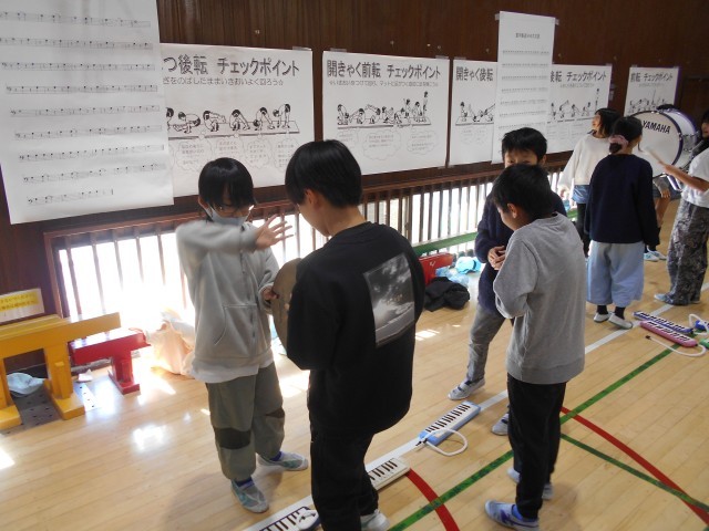 「銀河鉄道999」の演奏を、それぞれの楽器担当の6年生が5年生に丁寧に教えていました。5年生は初めて触れる楽器にも興味をもち、楽しみながら練習する様子が見られました。