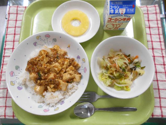 マーボー豆腐は、赤味噌やしょうゆ・砂糖・ごま油・トウバンジャンなどで味付けしています。トウバンジャンは辛味がある調味料なので、辛くなりすぎないように調節しています。子どもたちはごはんといっしょにたくさん食べていました。