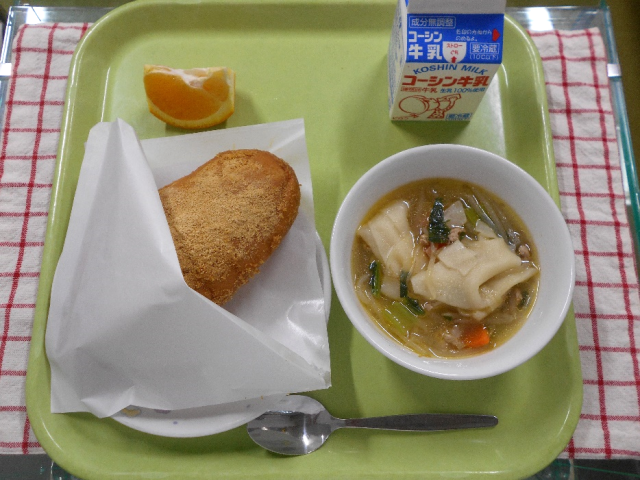 揚げパンは幅広い世代で人気のある給食定番料理です。コッペパンを高温の油でさっと揚げてきなこ砂糖をまぶします。ワンタンスープも人気の料理なので、完食している児童が多かったです。