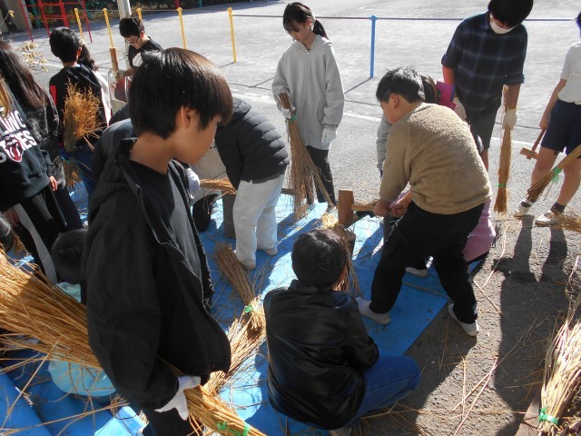 体育館で藁綯い(わらない)を行いました。最初に、水で濡らした藁を木槌などで叩き柔らかくしました。大切なのは根元を重点的に叩き柔らかくすることです。その後、数本の藁をまとめて綯っていきました。綯うのはコツがいるので、苦戦している子も多いようでした。それでも何とか縄を綯い、作った縄をつなげて大縄にして遊んでいる児童もいました。縄を綯う経験は中々できることではありません。今回とても貴重な経験をさせていただきました。事前の準備と片付けをしていただいたグリーンボランティアの皆様、どうもありがとうございました。