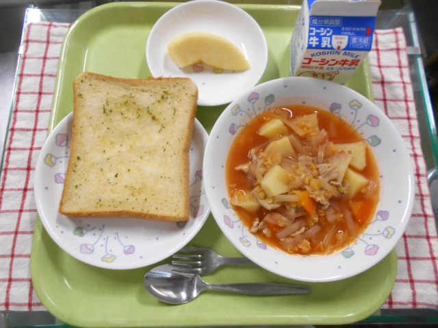 レンズ豆のスープは鉄分強献立です。鉄分が豊富なレンズ豆をたっぷり入れています。 りんごは長野県産のサンふじが届きました。どれもよく食べていました。