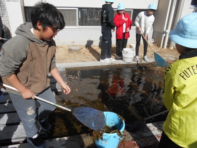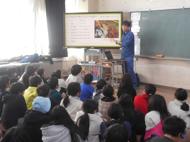 水研クリエイトの方を招き、出前授業を行いました。前半は、生き物の暮らしやすいビオトープや、ビオトープの効果について、画像を交えながら教えていただきました。また、池だけではなく、草原のビオトープがあることも知りました。最近では、池と同じように草原も減っているそうです。後半は、ビオトープの清掃とビオトープをより発展させるアイデアを考えました。どんな風に発展していくのか楽しみです。