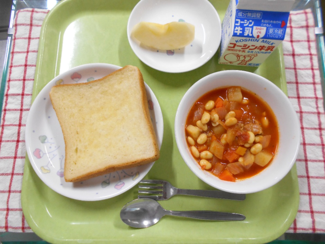 ポークビーンズは豚肉と豆をトマト味で煮込んだ料理です。白いんげん豆を使うこともありますが、今回は大豆をつかって作りました。豚肉と大豆でタンパク質をしっかりとることができます。