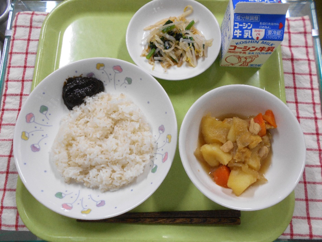 のりのつくだ煮は、粉になったのりをだし汁・しょうゆ・さとう・みりんで煮詰めて作ります。真っ黒の見た目ですが、ごはんとよく合い子どもたちからも人気のあるメニューです。肉じゃがは豚肉を使っていますが、今回は鶏肉で作ってみました。いつもの肉じゃがとは少し違う味わいです。