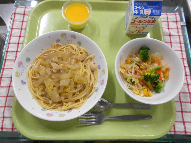 冬季オリンピックが始まりました。今年はイタリアのミラノ・コルティナで開催されています。今日は、オリンピックにちなんでイタリア料理献立です。スパゲッティには、鉄分が豊富なあさりを使用しました。パンナコッタはイタリアのデザートです。「パンナ」は「生クリーム」、「コッタ」は「加熱した」という意味です。今回は生クリームと牛乳で作ったパンナコッタにオレンジソースをかけました。少し柔らかくなってしまったので、次回やるときは分量を調整したいと思います。