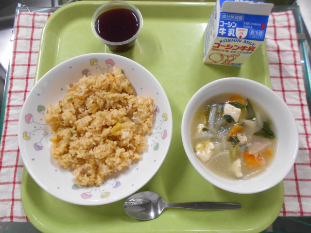 今日から3月です。週初めの月曜日に元気が出るように人気のキムチチャーハンを作りました。キムチの汁を搾り低学年と高学年で少し辛さを変えています。たくさん作りましたが、空になっているクラスが多かったです。参鶏湯風スープは、鶏肉にもち米や高麗人参、にんにくなどを詰めて煮込んだ参鶏湯をイメージして作りました。鶏肉は食べやすい小間切れにして入れ、もち米の代わりに米粉を加えています。
