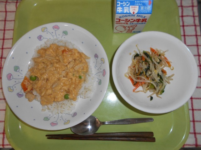今日は鉄分強化メニューの日です。『変わり親子丼』がそのメニューにあたります。