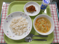 あぶたま丼は、油揚げと鶏肉、玉ねぎを煮て、たまごでとじた料理です。親子丼に油揚げを加えたものです。少し甘めの味にしているので子どもたちもよく食べていて完食しているクラスも多かったです。