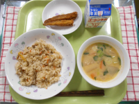 連休明けの給食は人気献立のキムチチャーハン、ワンタンスープです。キムチチャーハンはキムチや豚肉、にんじん、ピーマンが入っています。キムチは絞ってキムチの汁の量を低学年と高学年で変えて辛さを調節しています。