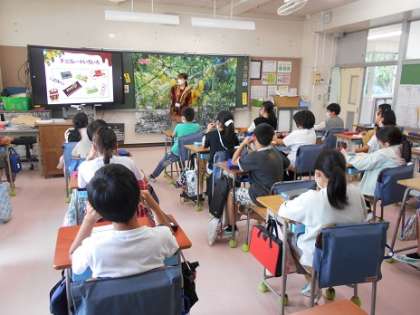 5年生は、3,4時間目に明治出前授業を行いました。みんなが大好きチョコレートがどんな風にできているのか詳しく教えていただきました。チョコレートの原料のカカオ豆はアフリカから2週間の時間をかけて船で日本に運ばれてくること、おいしいチョコレートには焙煎(ロースト)や練り上げ、エイジング(寝かせる)の工程が大切であることなど、知らなかったことがたくさんありました。児童はメモを取りながら、真剣に話を聞いていました。