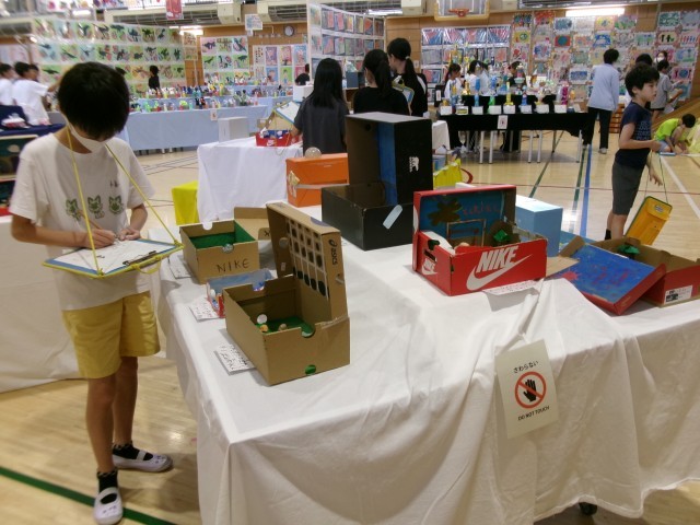 どの子も体育館の隅から隅まで全ての作品を見て、作品のすてきなところを鑑賞カードに書いています。自分以外の学年・学級の作品に興味津々です。じっと立ち尽くして作品を見る子もいました。それぞれの鑑賞の仕方がありますね。