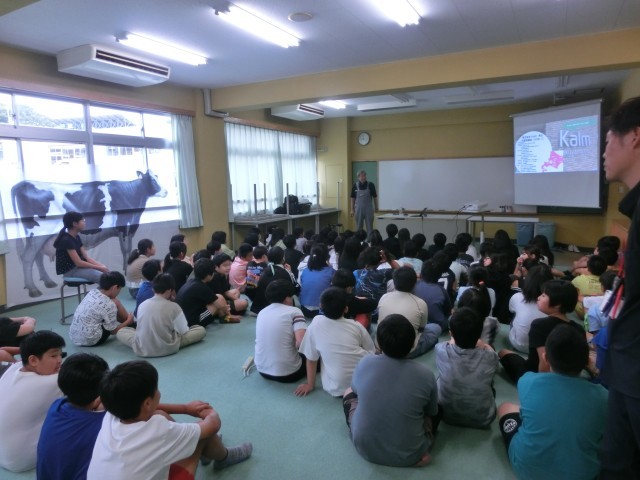 今日は、若木小学校を卒業して、現在、北海道でロボットを活用した酪農を営んでいる川口谷さんが5年生のために来校してくださいました。