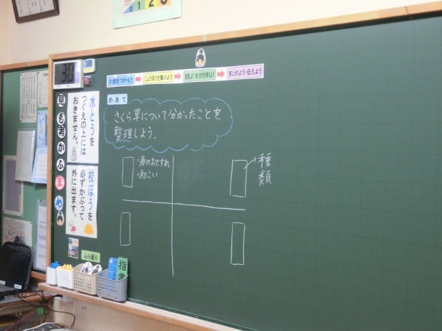 黒板には、めあて「さくら草について分かったことを整理しよう」とともに、「課題をつかもう」→「情報を集めよう」→「整理しよう・まとめ方を考えよう」→「まとめよう・伝えよう」と学習の流れもわかるように掲示されていました。