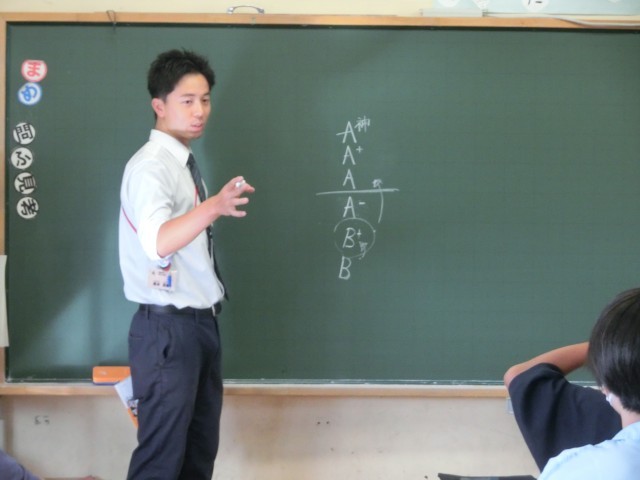 子どもたちが前の授業でまとめたノートについて、栗本先生が確認して返却し、評価の観点について説明していました。