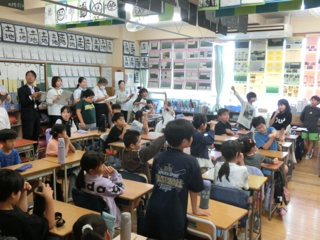 運動会をとおしてクラスのめあてに近づこうとする態度を身につけることをねらいに実施し、板橋区教育委員会の大瀧指導主事、伊藤指導主事をはじめ、区内の多くの先生方に子どもたちが積極的に発言する姿を見ていただきました。