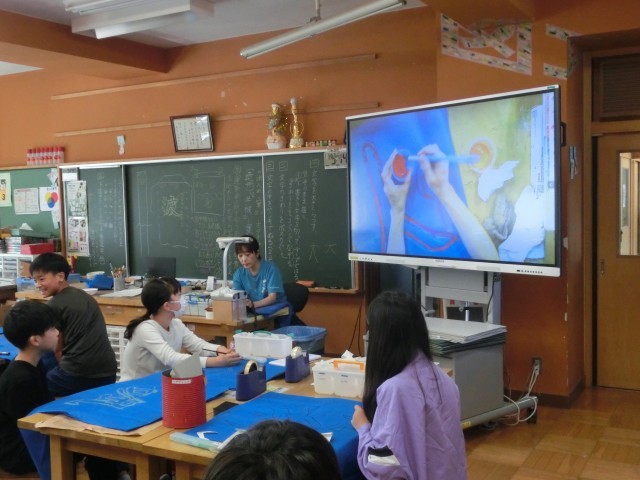 庄子先生が、きれいに色を塗ることができるように書画カメラで見えやすいように筆先を拡大して写しながら説明していました。