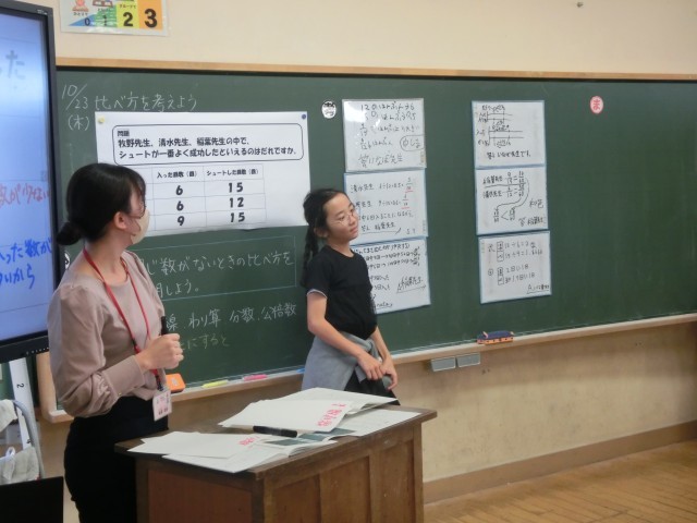 成功回数だけでなく、シュートした回数も異なる状況で、どのようにして答えを導けばよいのか、子どもたちは、これまで学んできたことがなんとか生かせないか考えながら、取り組みました。