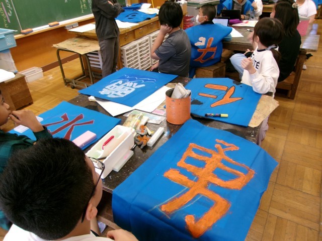 演技で着用する半被には、児童が一文字ずつ選んだ漢字を力強く書き入れました。