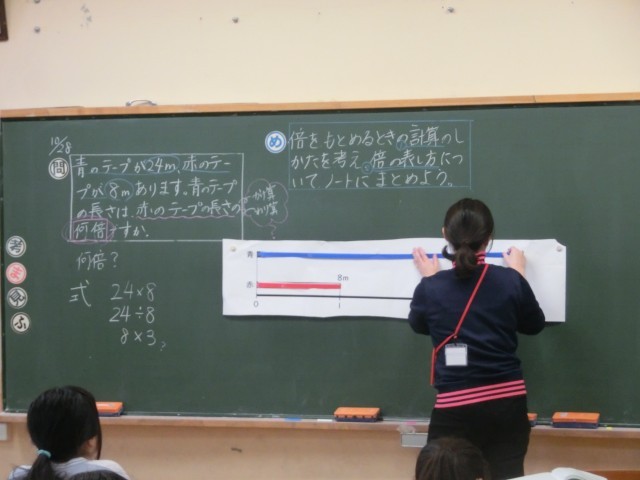 今日の問題「青のテープが24m、赤のテープが8mあります。青のテープの長さは赤のテープの長さの何倍ですか?」について、石坂先生も中鉢先生も、縮小した青と赤のテープを子どもたちに示していました。