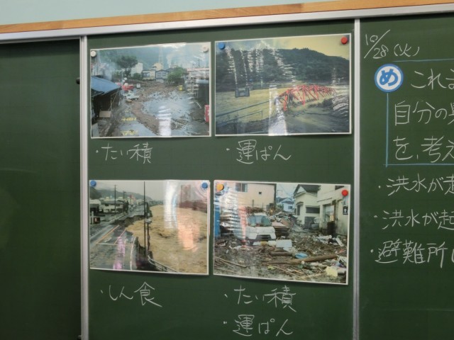 流れる水のはたらきの学習のまとめとして、大雨や洪水が起きる際・起きた際にどのような備えや対策が必要か考える活動をしていました。