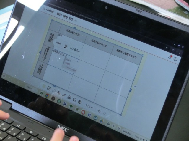 実際の災害の記録写真を掲示したり、アプリを活用してみんなで考えを共有できるような工夫がされていました。