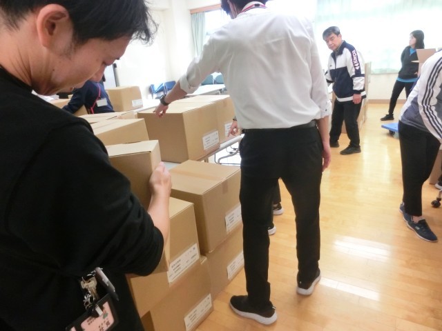 今日は先生たちみんなで全校児童の端末を運び出しました。これから、一人一人のパソコンにラベルを貼ったりします。
