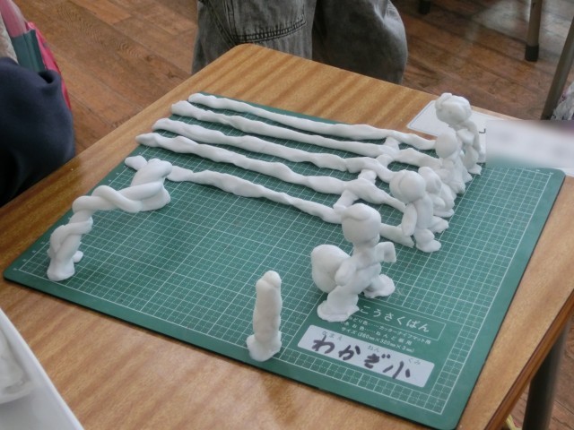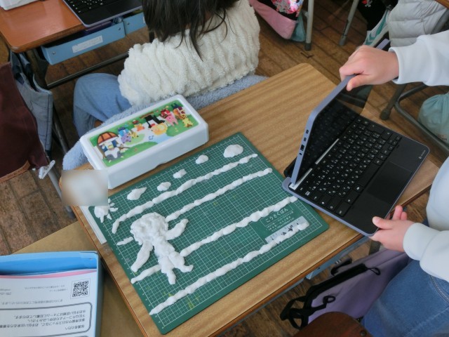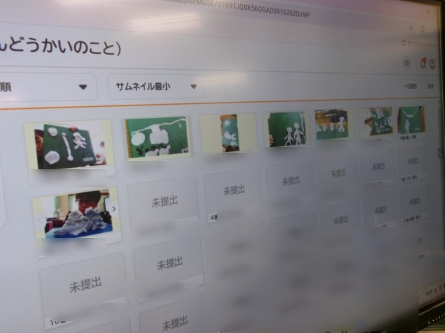 つくった作品は、自分のパソコンで写真を撮って、共有アプリに送信。教室前方の電子黒板にはそれぞれの作品の一覧が共有されていました。粘土は片付けのために崩さなければならないけど、写真で記録を残しておくことや一覧にして友達の作品も簡単に見られるようになるのはとてもよい工夫でした。