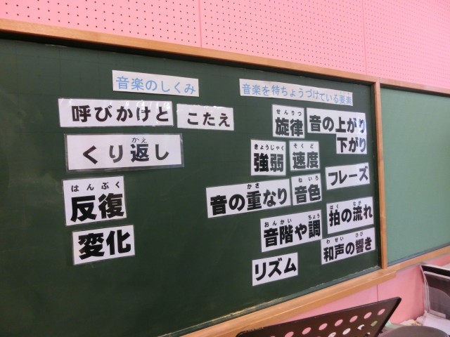 音楽室などの特別教室や各学級には、子どもたちの学びを支えるための掲示物の工夫をしています。