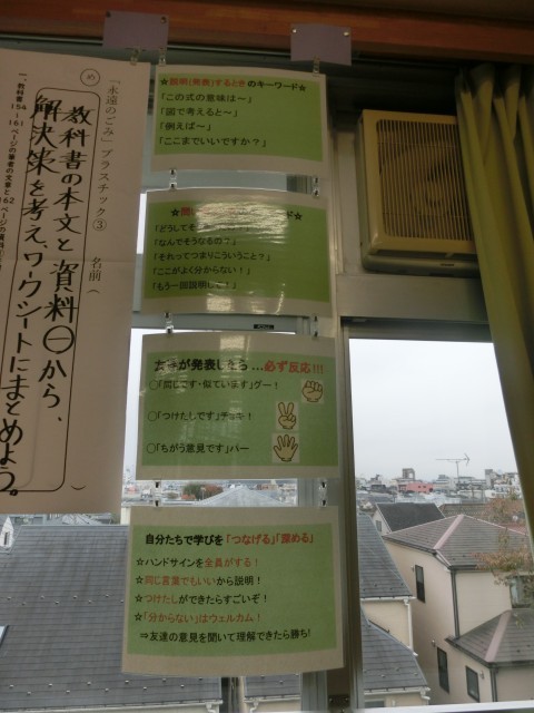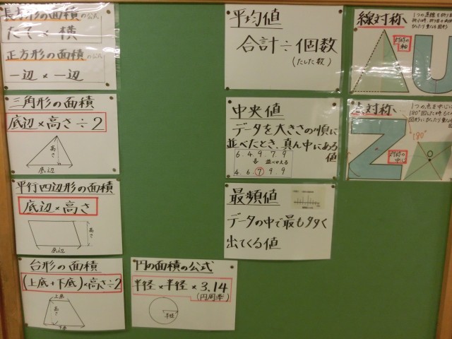 教室前方は集中しやすいように余計な情報は無しにシンプルにするようにしていますが、側面や後方は考えたりするときのヒントになるものや学習の記録を掲示しています。