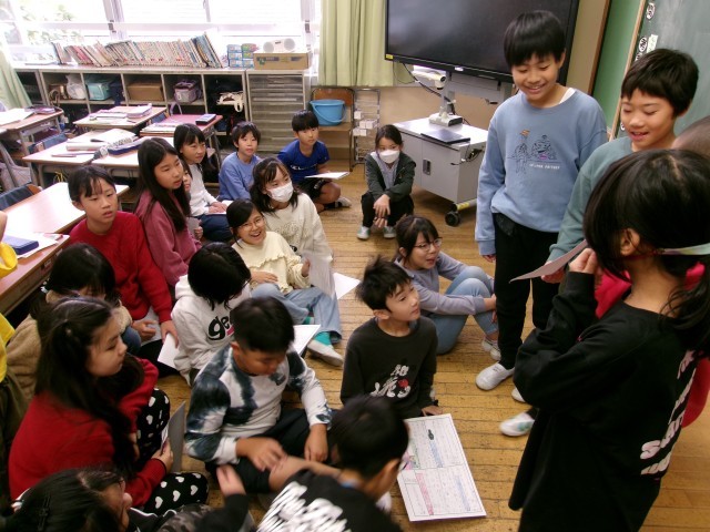 国語の授業で作成した「和と洋新聞」の発表の様子です。
