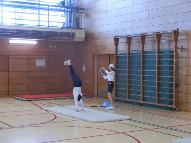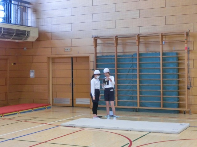 体育館体育のマット運動でタブレットPCを活用して取り組んでいました。