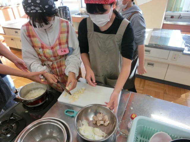 少し緊張しながらでしたが、安全に気をつけて、ジャガイモやタマネギを包丁を使って切ることができていました。