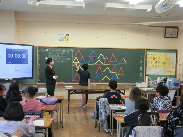 3つの長さの棒を組み合わせて三角形をつくり、辺の長さに着目してグループ分けする活動を通して三角形の性質についての理解を深める内容でした。