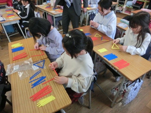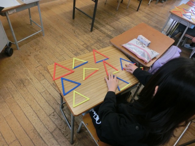 三角形をつくる棒を一人一人にきちんと準備されていて、それぞれが実際に三角形をつくってみることで、活動に対する意識・意欲も高まっていました。