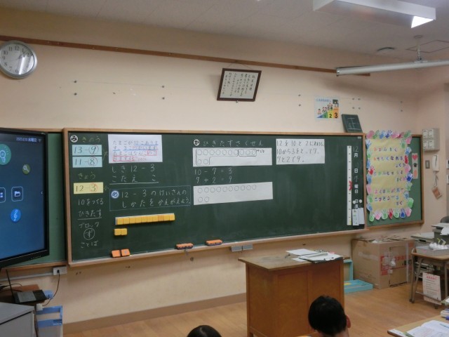 昨日は「11-8」の問題でまず10のまとまりから8を引いて考えていく求め方を学習していましたが、今日は10のまとまりと分けた2の方から引く考え方が中心の学習でした。