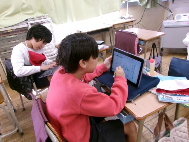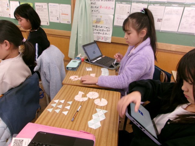 また、敷き詰めてできた形をタブレットで共有したり、電子黒板に投影したりして交流しました。