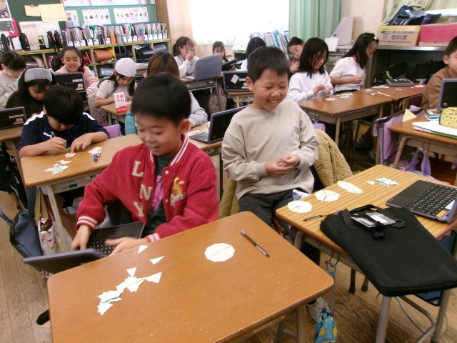 組み合わせることで大きな二等辺三角形や正三角形が作れることに気付いたり、身近な物の形を作ったりと楽しみながら活動に取り組んでいました。