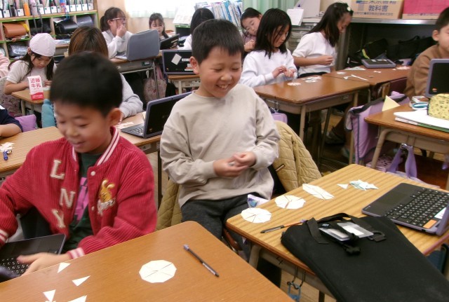 組み合わせることで大きな二等辺三角形や正三角形が作れることに気付いたり、身近な物の形を作ったりと楽しみながら活動に取り組んでいました。