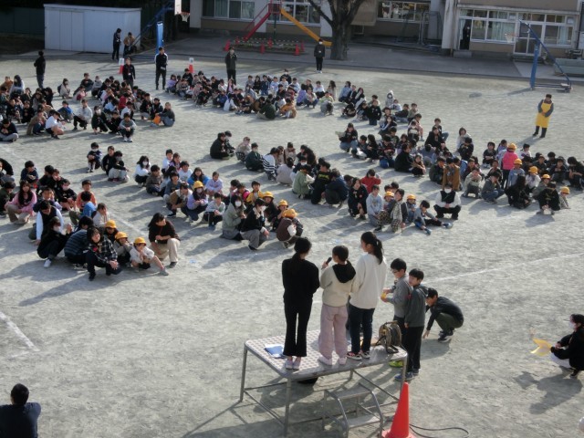 24日(土)の学校公開で披露するけん玉ダンスに向けて、なかよし班での並び方や場所の確認を行った後に実際に曲に合わせてダンスをしました。
