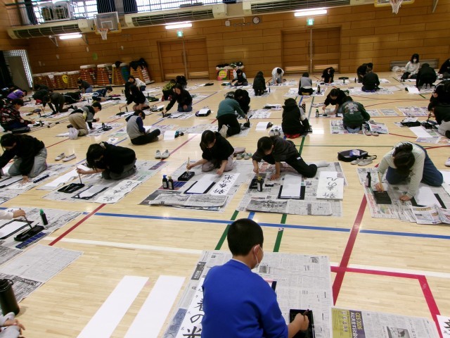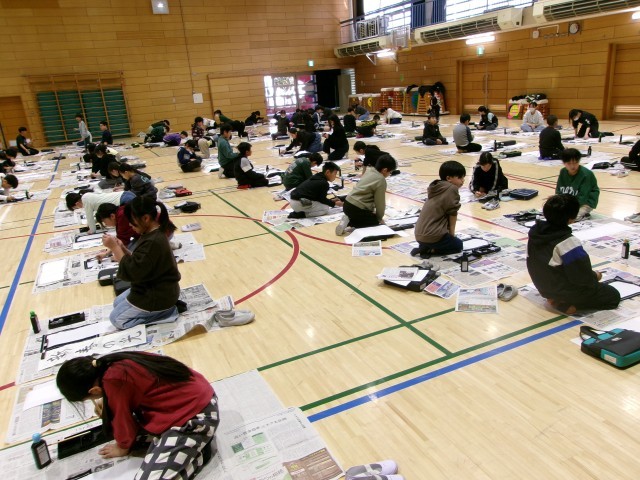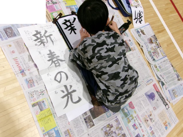 先程もお知らせいたしましたが、本日、席書会を実施いたしました。子どもたちは、新しい一年の決意を込めて「新春の光」という文字に挑戦しました。体育館には程よい緊張感が漂い、どの子も一筆一筆に集中して、力強く筆を運ぶ姿が非常に印象的でした。冬休みの練習の成果が存分に発揮され、新春にふさわしい、光り輝くような作品が揃っています。完成した作品は後日、各教室前にて掲示いたしますので、ぜひ楽しみになさってください。