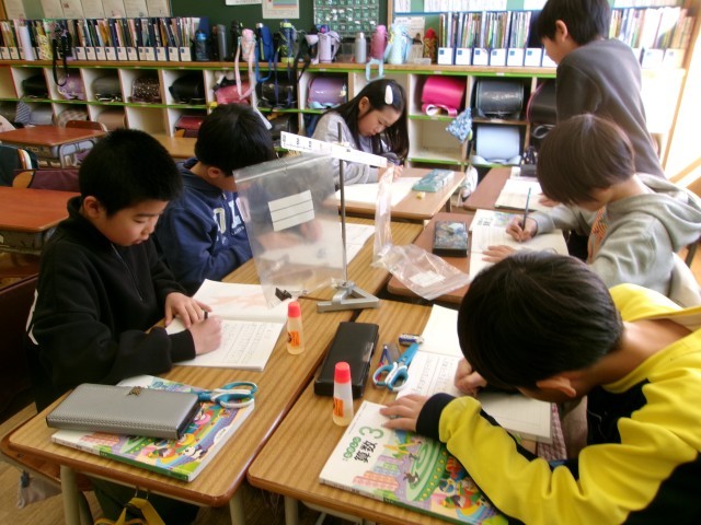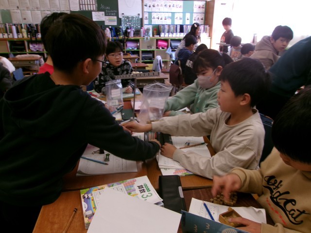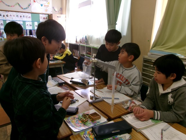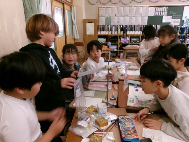 算数「重さを調べよう」では、てこを使って、積み木や1円玉の数を変えながら、いろいろな道具の重さを比べました。実際に比べることで、重さのちがいについて学びを深めていました。