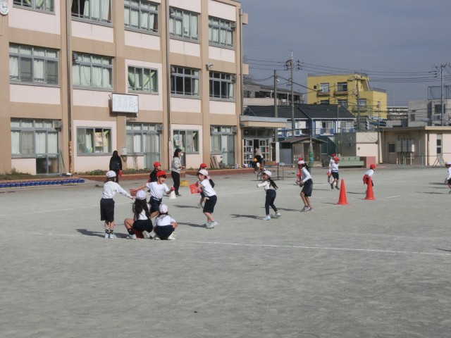 1年生が校庭で元気よく体育「鬼遊び」に取り組んでいました。