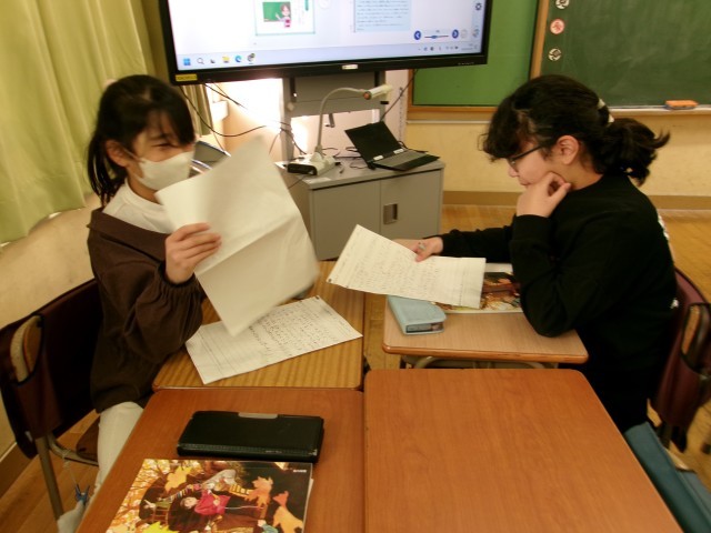 今4年生は国語で、「自分なら、どちらを選ぶか」という学習に取り組んでいます。この学習は理由を吟味して、自分なりに考えを書いて友達と読み合うという事をします。多様な意見を聞いて考えを深めました。