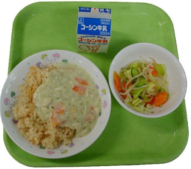 パプリカ粉を入れて炊いたごはんに、とり肉と野菜、きのこをたっぷり入れたクリームソースをかけました。